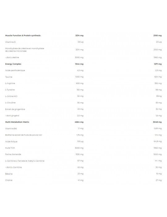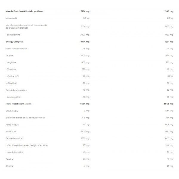 | Monohydrate de créatine et monohydrate de créatine micronisée | 3214 mg | 2100 mg | |