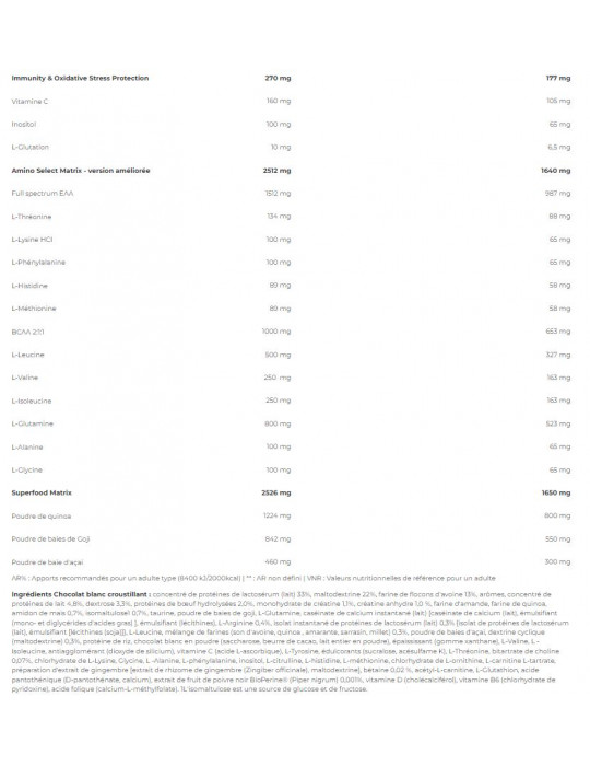 Ingrédients Chocolat : Concentré de protéines de lactosérum 33%, Maltodextrine 19%, Farine de flocons d'avoine 13%, Poudre de cacao dégraissée, Concentré de protéines de lait 4.8%, Arômes, Dextrose 3.3%, Poudre d'huile de triglycérides à chaîne moyenne 2.8% [triglycérides à chaîne moyenne, agent de charge (gomme d'acacia), agent anti-agglomérant (dioxyde de silicium)], Protéine de bœuf hydrolysée 2%, Créatine Monohydrate 1.1%, créatine anhydre 1%, farine d'amande, poudre de quinoa, amidon de maïs 0.7%, PalatinoseTM (Isomaltulose*) 0.7%, taurine, poudre de baies de Goji, L-Glutamine, caséinate de calcium [(caséinate de calcium, émulsifiant (mono- et diglycérides d'acides gras)], émulsifiant (lécithines), carbonate de magnésium, L-Arginine 0.4%, isolat de protéine de lactosérum instantané 0.3% [isolat de protéines de lactosérum, émulsifiant : lécithines (soja)], L-leucine, mélange de farines ModCarbTM 0.3% (son d'avoine, quinoa, amarante, sarrasin, millet), poudre de baies d'açai, Cluster Dextrin® (maltodextrine) 0.3%, Protéine de Riz, Épaississant (Gomme Xanthane), L-Valine, L-Isoleucine, Édulcorants (Sucralose, Acesulfame K), Beta-Alanine 0.13%, Acide L-Ascorbique, L-Tyrosine, L-Thréonine, Bitartrate de Choline 0.07%, L-Lysine HCl, L-Glycine, L-Alanine, L-Phénylalanine, Inositol, L-Citrulline, L-Histidine, L-Méthionine, L-Ornithine HCl, L-Carnitine-L-Tartrate, Extrait de Gingembre [Extrait de Rhizome de Gingembre (Zingiber officinale), Maltodextrine], L-Tryptophane, Bétaïne, Acetyl-L-Carnitine HCl, L-Glutathione, Extrait de feuille et de fleur de trèfle rouge (Trifolium pratensel ), Sélénite de sodium, Bisglycinate de zinc (bisglycinate de zinc, glycine, acide (acide citrique), agent anti-agglomérant (dioxyde de silicium)), D-pantothénate, calcium, extrait de fruit de poivre noir (Piper Nigrum) BioPerine®, cholécalciférol, chlorhydrate de pyridoxine, picolinate de chrome, iodure de potassium, L-méthylfolate de calcium. *L'isomaltulose est une source de glucose et de fructose.