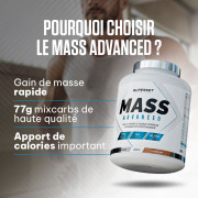 Ingrédients Choco Caramel Peanut : maltodextrine 34%, farine d’avoine complète (gluten) 22%, dextrose 20%, amidon de maïs cireux 10%, caséinate de calcium instantané (lait) [caséinate de calcium (lait), émulsifiant (mono- et diglycérides d’acides gras)] 8%, poudre de cacao dégraissée, arômes (arachides) (contient de la caféine), épaississant (gomme xanthane), sel, édulcorants (sucralose, acésulfame K), vitamine C (acide L-ascorbique), niacine (nicotinamide), bromélaïne d’ananas (1200 GDU/g), papaïne de papaye (1,5 FIP U/mg), vitamine B6 (chlorhydrate de pyridoxine), vitamine B1 (mononitrate de thiamine), vitamine B12 (cyanocobalamine), colorant (caramel de sulfite ammoniacal).