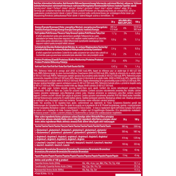 Vanille Fruits rouges : Protéines de lactosérum instantanées 87% {concentré de protéines de lactosérum (lait) [émulsifiant: lécithines (soja)], isolât de protéines de lactosérum (lait) [émulsifiant: lécithines (soja)]}, arômes, taurine 3,3%, L-arginine 1,7%, L-glutamine 1,7%, sel, épaississant (gomme xanthane), L-Leucine 0,3%, édulcorants (acésulfame K, sucralose), anti-agglomérant (dioxyde de silicium), bromélaïne extraite de l’ananas 0,07% (1200 GDU/g), papaïne extraite de la Papaye 0,07% (1,5 FIP U/mg), colorants (cramoisi*, Bleu brillant FCF).* Cramoisi: peut avoir des effets indésirables sur l’activité et l’attention chez les enfants.