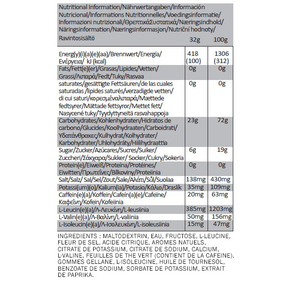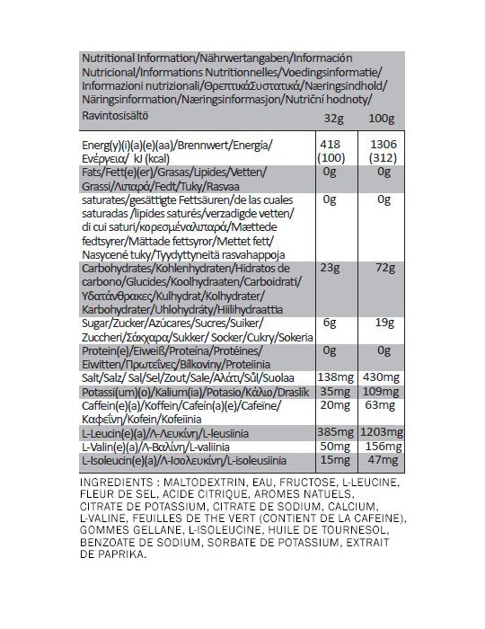 Ingrédients Citron : maltodextrine, eau, fructose, leucine, citrate de potassium, citrate de sodium, acide citrique, acide malique, carbonate de calcium, sel marin, valine, arôme naturel, gomme gellane, isoleucine, huile de tournesol, conservateur (benzoate de sodium, sorbate de potassium).