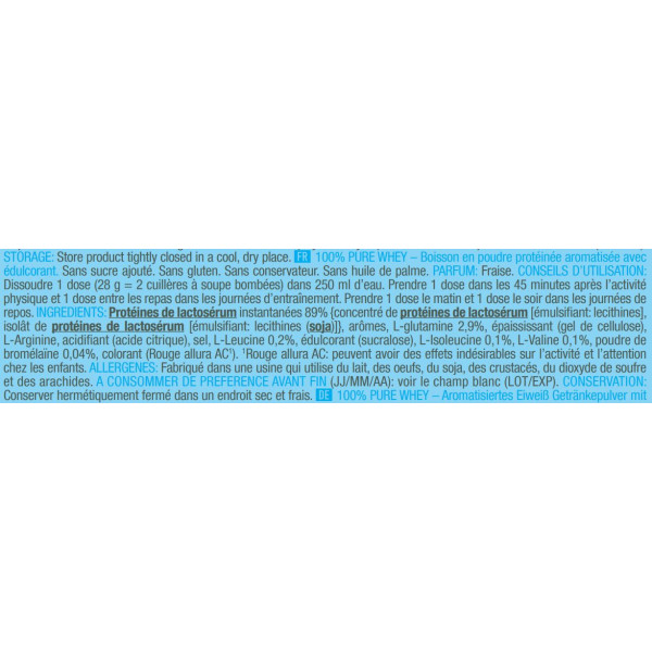 Ingrédients - saveur fraise : protéines de lactosérum instantanées 89% {concentré de protéines de lactosérum [émulsifiant : lécithines], isolat de protéines de lactosérum [émulsifiant : lécithines (soja)]}, arômes, L-glutamine 2,9%, épaississant (gel de cellulose), L-Arginine, acidifiant (acide citrique), sel, L-Leucine 0,2%, édulcorant (sucralose), L-Isoleucine 0,1%, L-Valine 0,1%, poudre de bromélaïne 0,04%, colorant (Rouge allura AC*).*Peut avoir un effet négatif sur l'activité et l'attention chez l'enfant.
