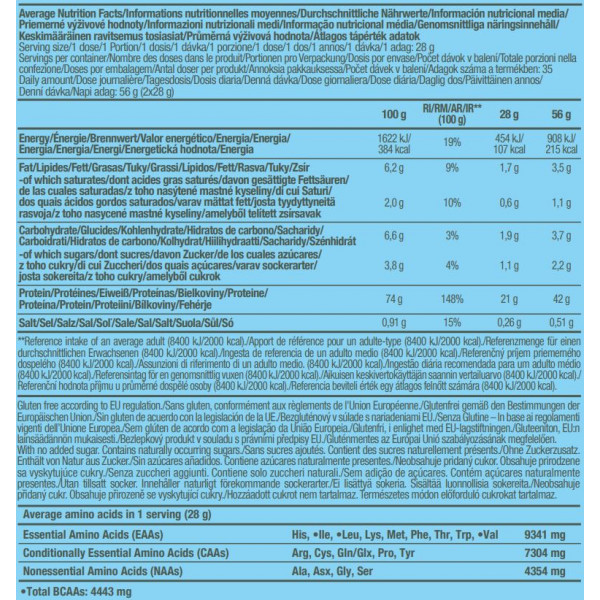 Elle est également enrichie en L-glutamine et L-arginine, deux acides aminés respectivement non essentiel et semi essentiel, et qui participent à la croissance musculaire et à la production d'oxyde nitrique (NO).