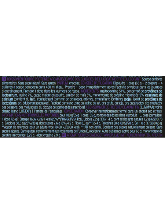 Ingrédients chocolat : maltodextrine 51%, concentré de protéines de lactosérum, inuline 7%, cacao maigre en poudre, amidon de maïs 5%, monohydrate de créatine micronisée 5%, caséinate de calcium (contient du lait), épaississant (gomme de cellulose), arômes, émulsifiant: lécithines (soja), isolat de protéines de lactosérum, sel, édulcorant (sucralose).