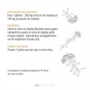 Ingrédients : Extrait de racine de rhodiola (rhodiola rosea - support: maltodextrine), poudre de racine de rhodiola (rhodiola rosea), gélule d'origine végétale : hypromellose, antiagglomérant: sels de magnésium d'acides gras.