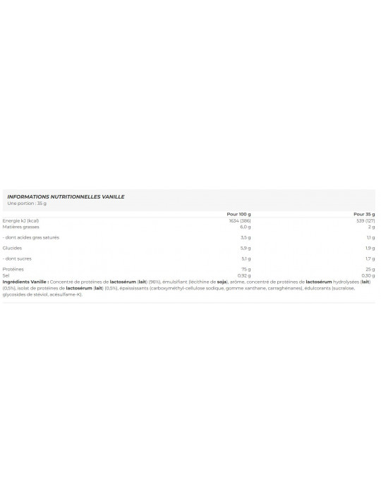 Ingrédients Vanille : Concentré de protéines de lactosérum (lait) (96%), émulsifiant (lécithine de soja), arôme, concentré de protéines de lactosérum hydrolysées (lait) (0,5%), isolat de protéines de lactosérum (lait) (0,5%), épaississants (carboxyméthyl-cellulose sodique, gomme xanthane, carraghénanes), édulcorants (sucralose, glycosides de stéviol, acésulfame-K).