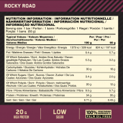 Ingrédients Rocky Road: Mélange de protéines de lait (isolat de protéines de lait, isolat de protéines de lactosérum, caséinate de calcium, isolat de protéines de lactosérum hydrolysé, émulsifiant : lécithine de soja), enrobage au chocolat au lait (18%) (concentré de protéines de lactosérum (lait), beurre de cacao, lait entier en poudre, édulcorant : Maltitol ; pâte de cacao, arôme naturel de vanille), couche saveur caramel au chocolat (11%) (humectant : glycérine, édulcorant : maltitol ; maltodextrine, fructo-oligosaccharides, huile de coco, lait écrémé en poudre, colorant : E150a ; émulsifiant : Lécithine de soja, arômes naturels, sel), humectant (glycérine), édulcorants (sorbitol, érythritol, sucralose), fructo-oligosaccharides, morceaux croustillants de soja au cacao (5%) (isolat de protéine de soja, poudre de cacao, amidon), morceaux croustillants de soja (5%) (isolat de protéine de soja, amidon, sel), polydextrose, isomalto-oligosaccharides, huile de tournesol, arômes, chlorure de sodium, morceaux de framboise lyophilisés, antioxydant (extrait riche en tocophérol).