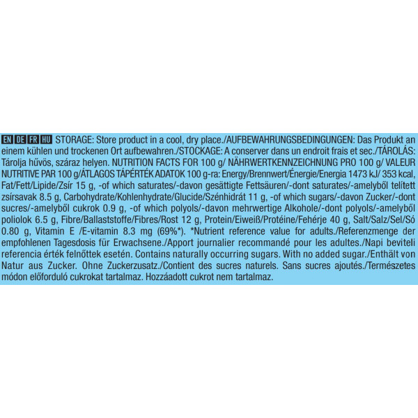 N'ayant pas de sucre ajouté, elle s'adapte parfaitement aux régimes de sèche musculaire et de perte de poids car elle contient seulement 190 kcal et 11 g de glucides par barre. Elle est également sans lactose et sans gluten.