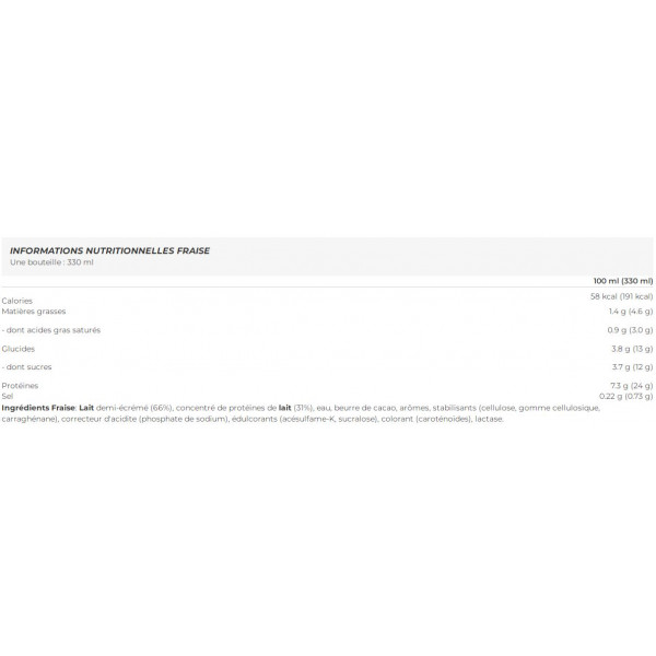Ingrédients Fraise: Lait demi-écrémé (66%), concentré de protéines de lait (31%), eau, beurre de cacao, arômes, stabilisants (cellulose, gomme cellulosique, carraghénane), correcteur d'acidite (phosphate de sodium), édulcorants (acésulfame-K, sucralose), colorant (caroténoïdes), lactase.