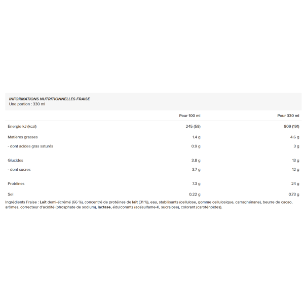 Ingrédients Fraise : Lait demi-écrémé (66 %), concentré de protéines de lait (31 %), eau, stabilisants (cellulose, gomme cellulosique, carraghénane), beurre de cacao, arômes, correcteur d’acidité (phosphate de sodium), lactase, édulcorants (acésulfame-K, sucralose), colorant (caroténoïdes).