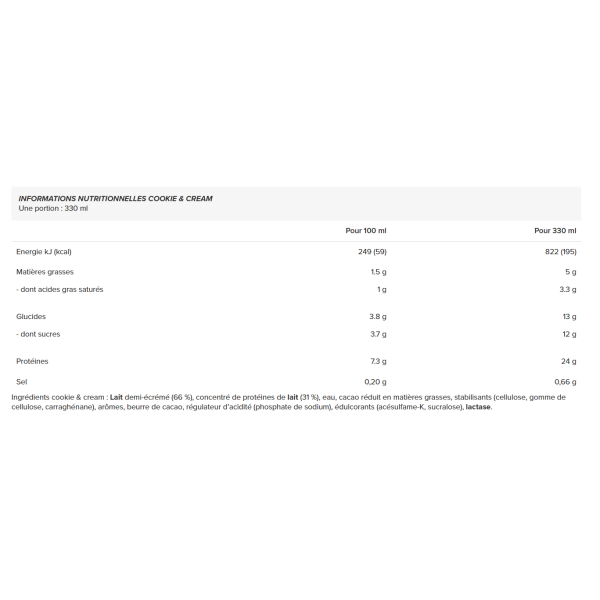 Ingrédients cookie & cream : Lait demi-écrémé (66 %), concentré de protéines de lait (31 %), eau, cacao réduit en matières grasses, stabilisants (cellulose, gomme de cellulose, carraghénane), arômes, beurre de cacao, régulateur d’acidité (phosphate de sodium), édulcorants (acésulfame-K, sucralose), lactase.