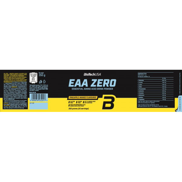 EAA zero (350g) de la marque Biotech USA est une combinaison d'acides aminés essentiels en poudre enrichie en L-Glutamine.