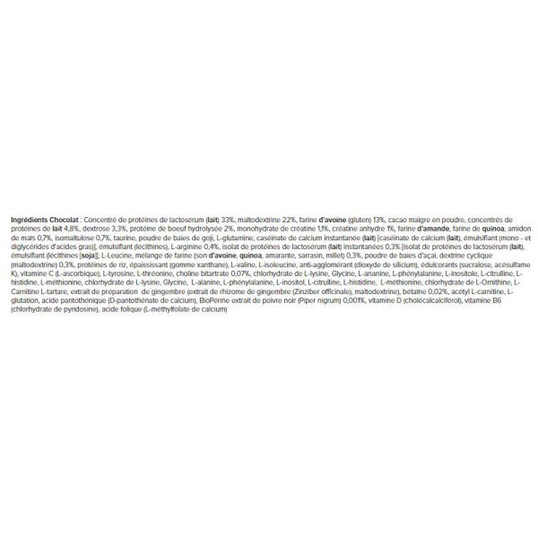 Ingrédients Chocolat : Concentré de protéines de lactosérum (lait) 33%, maltodextrine 22%, farine d'avoine (gluten) 13%, cacao maigre en poudre, concentrés de protéines de lait 4,8%, dextrose 3,3%, protéine de boeuf hydrolysée 2%, monohydrate de créatine 1,1%, créatine anhydre 1%, farine d'amande, farine de quinoa, amidon de maïs 0,7%, isomaltulose 0,7%, taurine, poudre de baies de goji, L-glutamine, caséinate de calcium instantanée (lait) [caséinate de calcium (lait), émulsifiant (mono - et diglycérides d'acides gras)], émulsifiant (lécithines), L-arginine 0,4%, isolat de protéines de lactosérum (lait) instantanées 0,3% [isolat de protéines de lactosérum (lait), émulsifiant (lécithines [soja]], L-Leucine, mélange de farine (son d'avoine, quinoa, amarante, sarrasin, millet) 0,3%, poudre de baies d'açai, dextrine cyclique (maltodextrine) 0,3%, protéines de riz, épaississant (gomme xanthane), L-valine, L-isoleucine, anti-agglomérant (dioxyde de silicium), édulcorants (sucralose, acésulfame K), vitamine C (L-ascorbique), L-tyrosine, L-thréonine, choline bitartrate 0,07%, chlorhydrate de L-lysine, Glycine, L-ananine, L-phénylalanine, L-inositole, L-citrulline, L-histidine, L-méthionine, chlorhydrate de L-lysine, Glycine, L-alanine, L-phénylalanine, L-inositol, L-citrulline, L-histidine, L-méthionine, chlorhydrate de L-Ornithine, L-Carnitine L-tartare, extrait de préparation de gingembre (extrait de rhizome de gingembre (Zinziber officinale), maltodextrine), bétaïne 0,02%, acétyl L-carnitine, L-glutation, acide pantothénique (D-pantothénate de calcium), BioPérine extrait de poivre noir (Piper nigrum) 0,001%, vitamine D (cholécalcalciférol), vitamine B6 (chlorhydrate de pyridosine), acide folique (L-méthylfolate de calcium)