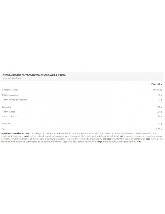 Ingrédients Cookies & Cream : Enrobage de chocolat au lait avec édulcorant 31% (édulcorant (maltitols)), beurre de cacao, lait entier en poudre, masse de cacao, émulsifiant : lécithines (soja), arôme naturel], couche de caramel avec édulcorant 18% [édulcorant (édulcorant (maltitols)), lait concentré, beurre de cacao, humectant (sorbitol), émulsifiant (mono- et diglycérides d’acides gras), arôme, sel, colorant (caramel)], protéines du lait, soja extrudé 8,6% (isolat de protéine de soja, farine de riz, extrait de malt d’orge, sel), hydrolysat de collagène, humectant (glycérol), eau, isolat de protéine de soja, huile de coco, arôme (contient du lait).