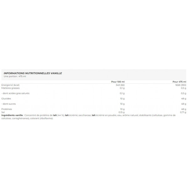 Ingrédients vanille : Concentré de protéine de lait (44 %), lait écrémé, saccharose, lait écrémé en poudre, eau, arôme naturel, stabilisants (cellulose, gomme de cellulose, carraghénanes), colorant (riboflavine).