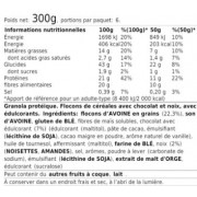 Ingrédients - saveur noisette amande chocolat : flocons d'avoine en grains (22,3%), son d'avoine, gluten de blé, fibres de maïs solubles, chocolat avec édulcorant (7%) (édulcorant (maltitol), pâte de cacao, émulsifiant (lécithine de soja), cacao maigre en poudre, arôme naturel de vanille),huile de tournesol, affermissant (maltitol), farine de blé, noix (2%) (noisettes, amandes), sel, arômes, poudre à lever (carbonate de sodium), émulsifiant (lécithine de soja), extrait de malt d'orge, édulcorant (sucralose).