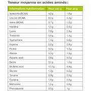 | Teneur en acides aminés : - isoleucine (BCAA) - Leucine (BCAA) - Valine (BCAA) - Histidine - Lysine - Threonine - Tryptophane - Arginine - Proline - Alanine - Aspartic acid - serine - glutamic acid - glycine - tyrosine - cysteine - méthionine - phenylalanine |