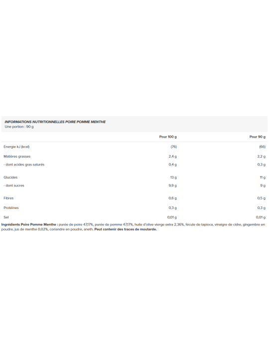 Ingrédients Poire Pomme Menthe : purée de poire 47,17%, purée de pomme 47,17%, huile d’olive vierge extra 2,36%, fécule de tapioca, vinaigre de cidre, gingembre en poudre, jus de menthe 0,02%, coriandre en poudre, aneth. Peut contenir des traces de moutarde.