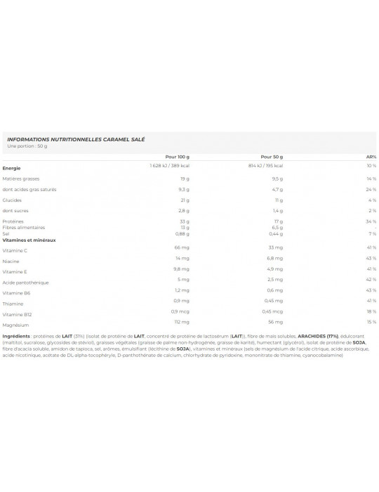 Ingrédients - saveur caramel salé : protéines de LAIT (31%) (isolat de protéine de LAIT, concentré de protéine de lactosérum (LAIT)), fibre de maïs solubles, ARACHIDES (17%), édulcorant (maltitol, sucralose, glycosides de stéviol), graisses végétales (graisse de palme non-hydrogénée, graisse de karité), humectant (glycérol), isolat de protéine de SOJA, fibre d'acacia soluble, amidon de tapioca, sel, arômes, émulsifiant (lécithine de SOJA), vitamines et minéraux (sels de magnésium de l'acide citrique, acide ascorbique, acide nicotinique, acétate de DL-alpha-tocophéryle, D-panthothénate de calcium, chlorhydrate de pyridoxine, mononitrate de thiamine, cyanocobalamine).