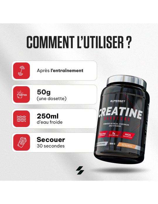 Pour maximiser tes résultats, utilise la Créatine Hardcore régulièrement, par cure, associée à un entraînement lourd et une alimentation riche en protéines. De cette façon, la créatine te permettra d’augmenter l’explosivité sur des efforts courts et intenses, et ainsi augmenter l’intensité. Au final, tu charges plus et tu améliores le développement musculaire.