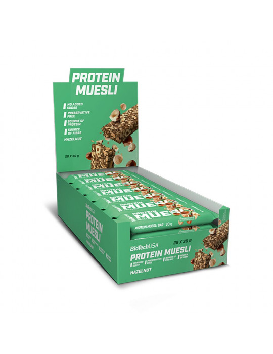 Les barres Protein Muesli (28x30g) sont des barres véganes fabriquées par la marque Biotech USA.