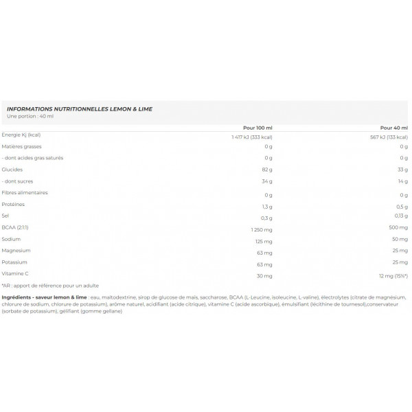 Ingrédients - saveur lemon & lime : eau, maltodextrine, sirop de glucose de maïs, saccharose, BCAA (L-Leucine, isoleucine, L-valine), électrolytes (citrate de magnésium, chlorure de sodium, chlorure de potassium), arôme naturel, acidifiant (acide citrique), vitamine C (acide ascorbique), émulsifiant (lécithine de tournesol), conservateur (sorbate de potassium), gélifiant (gomme gellane).