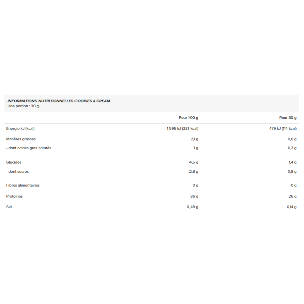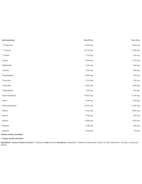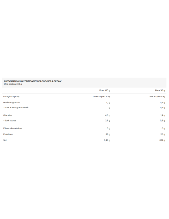 Ingrédients - saveur Cookies & Cream : Protéines de lait (isolat de lactosérum, émulsifiant : lécithine de tournesol), arôme, sel iodé, édulcorant : sucralose, poudre de lactase.