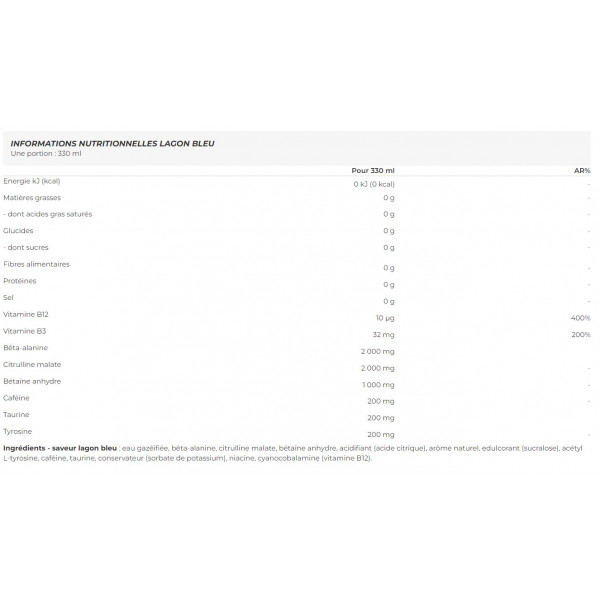 Ingrédients - saveur lagon bleu : eau gazéifiée, bêta-alanine, citrulline malate, bétaïne anhydre, acidifiant (acide citrique), arôme naturel, édulcorant (sucralose), acétyl L-tyrosine, caféine, taurine, conservateur (sorbate de potassium), niacine, cyanocobalamine (vitamine B12).