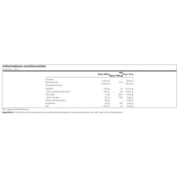 Ingrédient : Farine de racine de patate douce blanche biologique (Ipomoea Batatas). Issu de l'agriculture biologique.