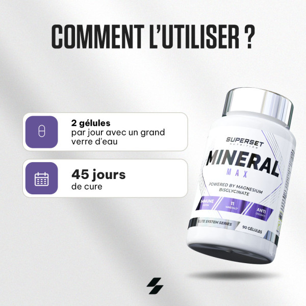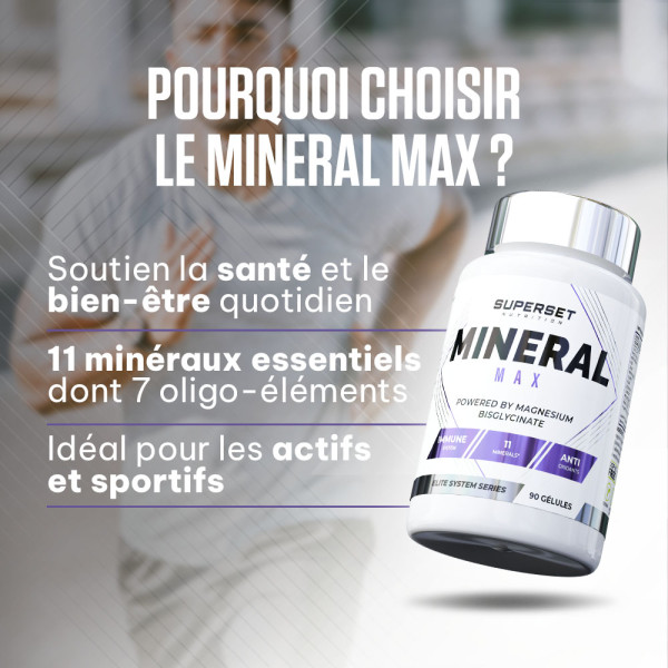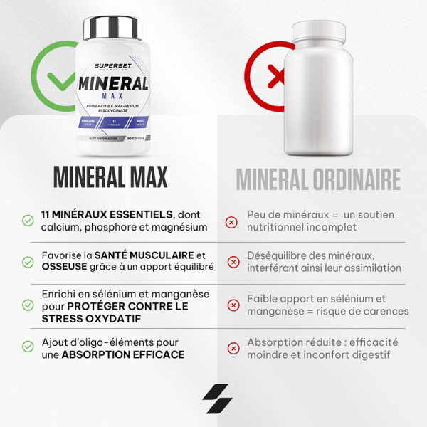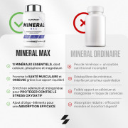 Ce MINERAL MAX (90 CAPS) est une formule d'ingrédients contenant 11 minéraux essentiels, chacun ayant un rôle spécifique dans le soutien de ta santé et de ton bien-être au quotidien, notamment le trio calcium, phosphore et magnésium, plébiscité des sportifs :