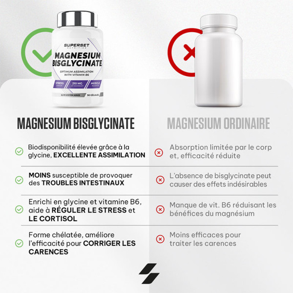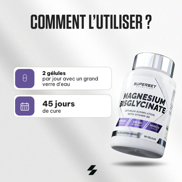 Ce MAGNESIUM BISGLYCINATE (90 CAPS) élaboré par les nutritionnistes et coachs de la marque Superset Nutrition est une combinaison de magnésium et de glycine : un acide aminé, qui offre une absorption optimale. Se supplémenter en magnésium a 3 principaux avantages :