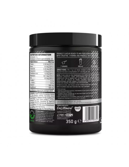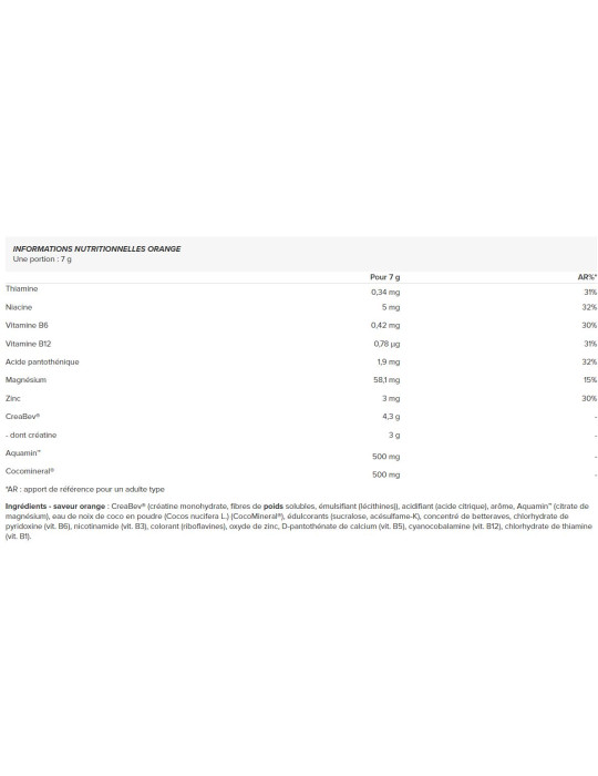 Ingrédients - saveur orange : CreaBev® (créatine monohydrate, fibres de poids solubles, émulsifiant (lécithines)), acidifiant (acide citrique), arôme, Aquamin™ (citrate de magnésium), eau de noix de coco en poudre (Cocos nucifera L.) (CocoMineral®), édulcorants (sucralose, acésulfame-K), concentré de betteraves, chlorhydrate de pyridoxine (vit. B6), nicotinamide (vit. B3), colorant (riboflavines), oxyde de zinc, D-pantothénate de calcium (vit. B5), cyanocobalamine (vit. B12), chlorhydrate de thiamine (vit. B1).