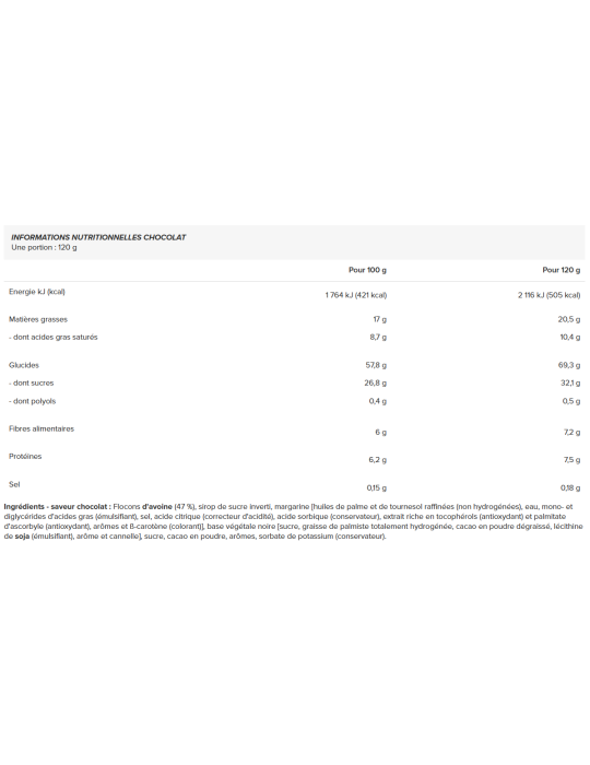 Ingrédients - saveur chocolat : Flocons d'avoine (49 %), sirop de sucre inverti, margarine [huiles de palme et de tournesol raffinées (non hydrogénées), eau, mono- et diglycérides d'acides gras (émulsifiant), sel, acide citrique (correcteur d'acidité), acide sorbique (conservateur), extrait riche en tocophérols (antioxydant) et palmitate d'ascorbyle (antioxydant), arômes et ß-carotène (colorant)], base végétale noire [sucre, graisse de palmiste totalement hydrogénée, cacao en poudre dégraissé, lécithine de soja (émulsifiant), arôme et cannelle], sucre, cacao en poudre, arômes, sorbate de potassium (conservateur).