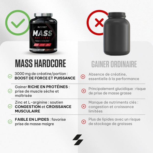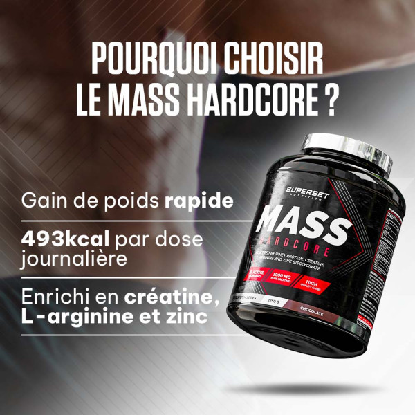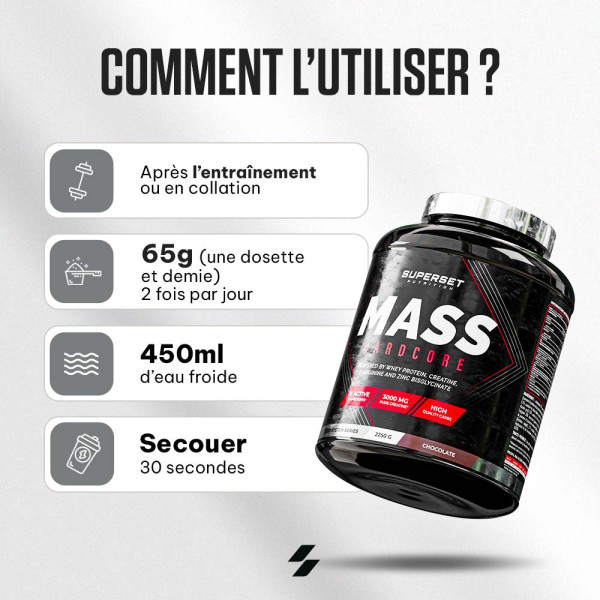 Ingrédients saveur chocolat : maltodextrine 52%, concentré de protéines de lactosérum instantané (lait) {concentré de protéines de lactosérum instantané (lait), émulsifiant [lécithines (soja)]} 14%, inuline 6,1%, caséinate de calcium (lait) [caséinate de calcium (lait), émulsifiant (mono- et diglycérides d’acides gras)] 5,8%, amidon de maïs cireux 5,1%, poudre de cacao dégraissée, chlorhydrate de l-arginine 2,8%, épaississant (gomme de cellulose), créatine monohydrate micronisée 2,6%, isolat de protéines de lactosérum instantané (lait) {isolat de protéines de lactosérum (lait), émulsifiant [lécithines (soja)]} 2,5%, émulsifiant [lécithines (soja),] arômes, sel, édulcorant (sucralose), bisglycinate de zinc, bromélaïne d’ananas (1200 GDU/g) 0,03%, papaïne de papaye (1,5 FIP U/mg) 0,03%.