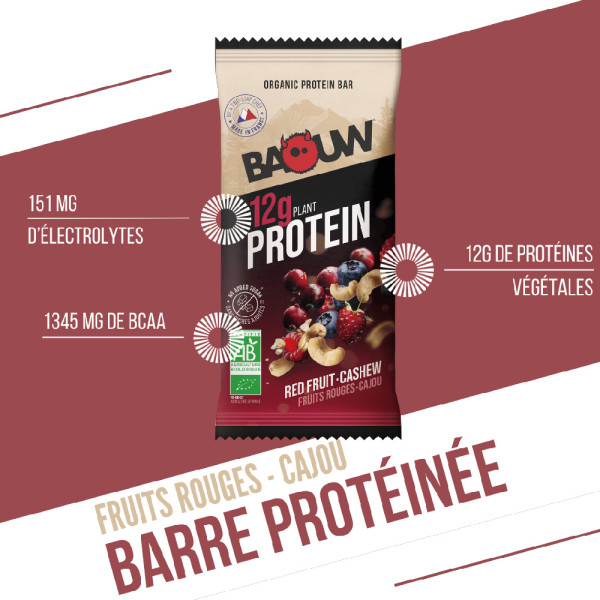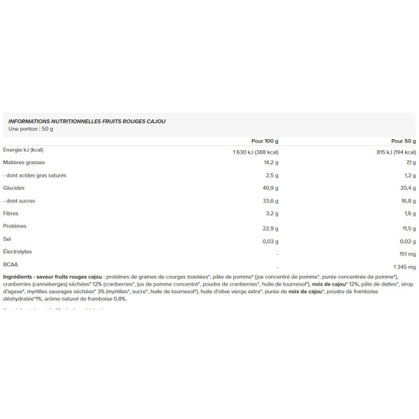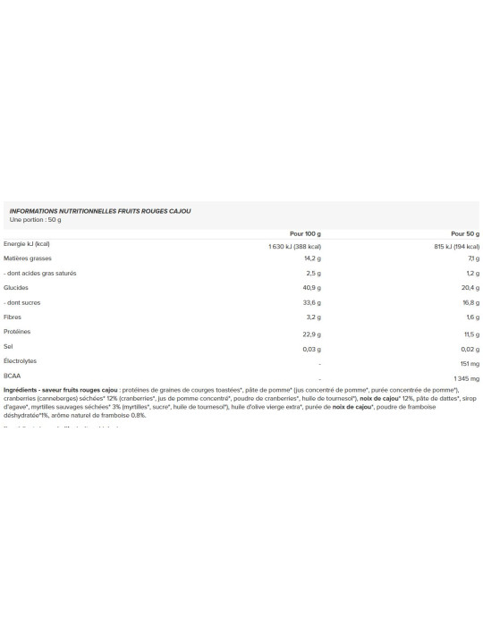 Ingrédients - saveur fruits rouges cajou : protéines de graines de courges toastées*, pâte de pomme* (jus concentré de pomme*, purée concentrée de pomme*), cranberries (canneberges) séchées* 12% (cranberries*, jus de pomme concentré*, poudre de cranberries*, huile de tournesol*), noix de cajou* 12%, pâte de dattes*, sirop d'agave*, myrtilles sauvages séchées* 3% (myrtilles*, sucre*, huile de tournesol*), huile d'olive vierge extra*, purée de noix de cajou*, poudre de framboise déshydratée*1%, arôme naturel de framboise 0.8%.