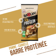 Ingrédients - saveur pomme cannelle : protéines de graines de courges toastées*, pâte de dattes*, pâte de pomme* 17% (jus concentré de pomme*, purée concentrée de pomme*), noix de cajou* 13%, sirop d'agave*, purée de noix de cajou*3%, huile d'olive vierge extra*, poudre de cannelle* 1.7%, arôme naturel de pomme 0.2%.