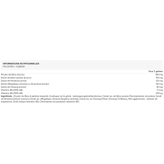 Ingrédients : poudre de maca (Lepidium meyenii), enveloppe de la gélule : hydroxypropylmethylcellulose, extrait sec de Muira puama (Ptychopetalum olacoides), extrait de Rhodiola (Sedum roseum), extrait sec d'Angélique chinoise (Angelica sinensis), extrait sec de ginseng (Panax Ginseng CA Meyer), anti-agglomérant : stéarate de magnésium, acide folique (vitamine B9), chlorhydrate de pyridoxine (vitamine B6).