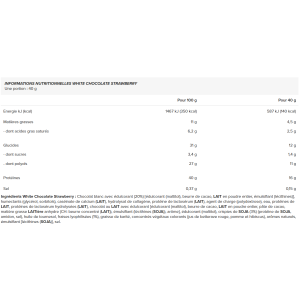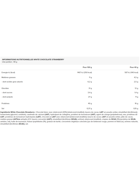 Ingrédients - White Chocolate Strawberry : chocolat blanc avec édulcorant (20%) [édulcorant (maltitol), beurre de cacao, LAIT en poudre entier, émulsifiant (lécithines)], humectants (glycérol, sorbitols), caséinate de calcium (LAIT), hydrolysat de collagène, protéine de lactosérum (LAIT), agent de charge (polydextrose), eau, protéines de LAIT, protéines de lactosérum hydrolysées (LAIT), chocolat au LAIT avec édulcorant [édulcorant (maltitol), beurre de cacao, LAIT en poudre entier, pâte de cacao, matière grasse LAITière anhydre (CH: beurre concentré (LAIT)), émulsifiant (lécithines (SOJA)), arôme], édulcorant (maltitol), crispies de SOJA (3%) (protéine de SOJA, amidon, sel), huile de tournesol, fraises lyophilisées (1%), graisse de karité, concentrés végétaux colorants (jus de betterave rouge, pomme et hibiscus), arômes naturels, émulsifiant [lécithines (SOJA)], sel.