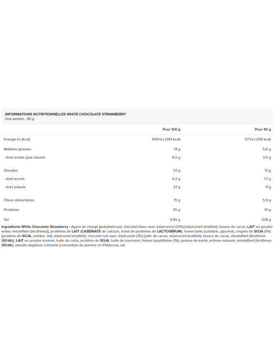 Ingrédients - White Chocolate Strawberry : agent de charge (polydextrose), chocolat blanc avec édulcorant (20%) [édulcorant (maltitol), beurre de cacao, LAIT en poudre entier, émulsifiant (lécithines)], protéines de LAIT (CASÉINATE de calcium, isolat de protéines de LACTOSÉRUM), humectants (sorbitols, glycérol), crispies de SOJA (5%) (protéine de SOJA, amidon, sel), édulcorant (maltitol), chocolat noir avec édulcorant (3%) [pâte de cacao, édulcorant (maltitol), beurre de cacao, émulsifiant (lécithines (SOJA))], LAIT en poudre écrémé, huile de colza, protéine de SOJA, huile de tournesol, fraises lyophilisées (1%), graisse de karité, arômes naturels, émulsifiant [lécithines (SOJA)], extraits végétaux colorants (concentrés de pomme et d'hibiscus), sel.