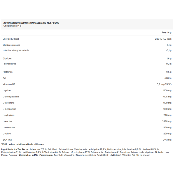 Ingrédients Ice Tea Pêche : L-Leucine 17,6 %, Acidifiant : Acide citrique, Chlorhydrate de L-Lysine 13,4 %, Maltodextrine, L-Isoleucine 8,8 %, L-Valine 8,8 %, L-Phénylalanine 7,1 %, L-Méthionine 6,4 %, L-Thréonine 6,4 %, Arôme, L-Tryptophane 1,7 %, Édulcorants : Acésulfame K, Sucralose, Arôme, Huile végétale : Noix de coco, Palme, Colorant : Caramel au sulfite d'ammonium, Agent de séparation : Dioxyde de silicium, Émulsifiant : Lécithines*, Vitamine B6. *de tournesol