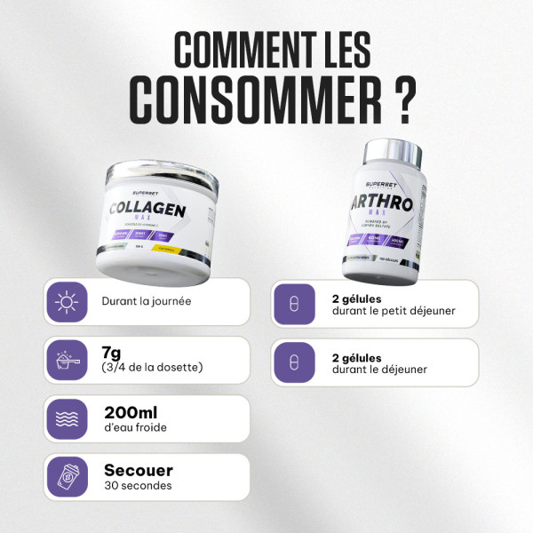 Ingrédients : sel de magnésium d'acide citrique, sulfate de glucosamine KCl (crustacés), gélule (gélatine), agent de charge (gel de cellulose), sulfate de chondroïtine, MSM [méthylsulfonylméthane, anti-agglomérant (dioxyde de silicium)], acide L-ascorbique, préparation d'acétate de DL-alpha-tocophéryl [acétate de DL-alpha-tocophéryl, anti-agglomérant (dioxyde de silicium)], anti-agglomérant (sels de magnésium d'acides gras), sulfate cuivrique.