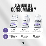 Ingrédients : acide gamma-aminobutyrique 76%, gélule (hydroxypropyl méthyl cellulose), agent de charge (gel de cellulose), agents anti-agglomérants (sels de magnésium d’acides gras, dioxyde de silicium), nicotinamide.