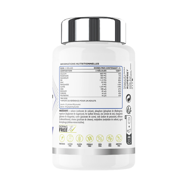 Ingrédients : calcium (carbonate de calcium), phosphore (phosphate de dihydrogène), magnésium (bisglycinate de magnésium), fer (sulfate ferreux), zinc (citrate de zinc), manganèse (gluconate de manganèse), cuivre (gluconate de cuivre), iode (iodure de potassium), sélénium (L-sélénométhionine), chrome (picolinate de chrome), molybdène (molybdate de sodium), agent de remplissage (cellulose microcristalline).