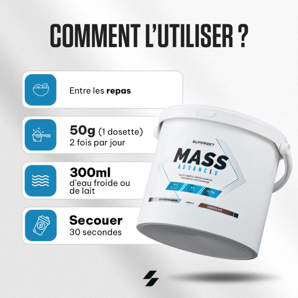 Ingrédients Chocolat : maltodextrine 34%, farine d’avoine complète (gluten) 20%, dextrose 20%, amidon de maïs cireux 10%, caséinate de calcium instantané (lait) [caséinate de calcium (lait), émulsifiant (mono- et diglycérides d’acides gras)] 8%, poudre de cacao dégraissée 5%, arômes, épaississant (gomme xanthane), édulcorants (sucralose, acésulfame K), vitamine C (acide L-ascorbique), niacine (nicotinamide), bromélaïne d’ananas (1200 GDU/g) 0,02%, papaïne de papaye (1,5 FIP U/mg) 0,02%, vitamine B6 (chlorhydrate de pyridoxine), vitamine B1 (mononitrate de thiamine), vitamine B12 (cyanocobalamine).