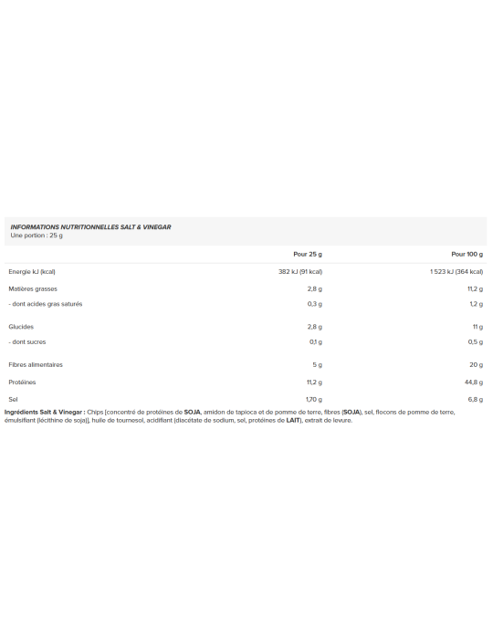 Ingrédients Salt & Vinegar : chips [concentré de protéines de SOJA, amidon de tapioca et de pomme de terre, fibres (SOJA), sel, flocons de pomme de terre, émulsifiant (lécithine de soja)], huile de tournesol, acidifiant (diacétate de sodium, sel, protéines de LAIT), extrait de levure.