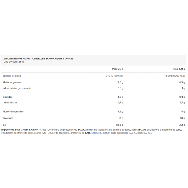 Ingrédients Sour Cream & Onion : chips [Concentré de protéines de SOJA, amidon de tapioca et de pomme de terre, fibres (SOJA), sel, flocons de pomme de terre, émulsifiant (lécithine de soja), arôme (LAIT), huile de tournesol, protéines de LAIT, sel marin, oignon grillé en poudre (0,2 %), persil (0,1 %)].