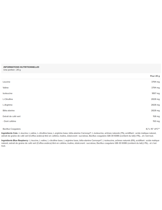 Ingrédients Cola : L-leucine, L-valine, L-citrulline base, L-arginine base, bêta-alanine Carnosyn®, L-isoleucine, arômes naturels (7%), acidifiant : acide malique naturel, extrait de graine de café vert (Coffea arabica) titré en caféine, inuline, édulcorant : sucralose, Bacillus coagulans GBI-30 6086 (contient du lait) (<1%)… et c'est tout.