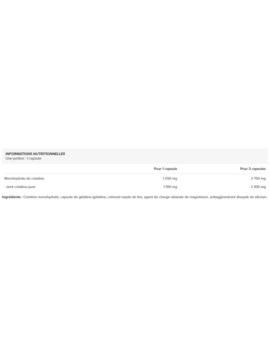 |   Monohydrate de créatine - dont créatine pure  |    1 250 mg 1 100 mg  |    3 750 mg 3 300 mg  |