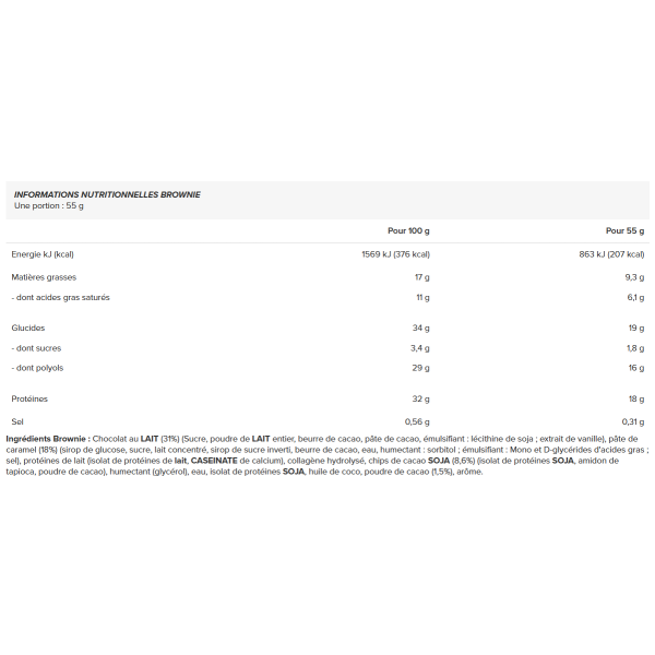 Ingrédients Brownie : chocolat au LAIT (31%) (Sucre, poudre de LAIT entier, beurre de cacao, pâte de cacao, émulsifiant : lécithine de soja ; extrait de vanille), pâte de caramel (18%) (sirop de glucose, sucre, lait concentré, sirop de sucre inverti, beurre de cacao, eau, humectant : sorbitol ; émulsifiant : Mono et D-glycérides d'acides gras ; sel), protéines de lait (isolat de protéines de lait, CASEINATE de calcium), collagène hydrolysé, chips de cacao SOJA (8,6%) (isolat de protéines SOJA, amidon de tapioca, poudre de cacao), humectant (glycérol), eau, isolat de protéines SOJA, huile de coco, poudre de cacao (1,5%), arôme.