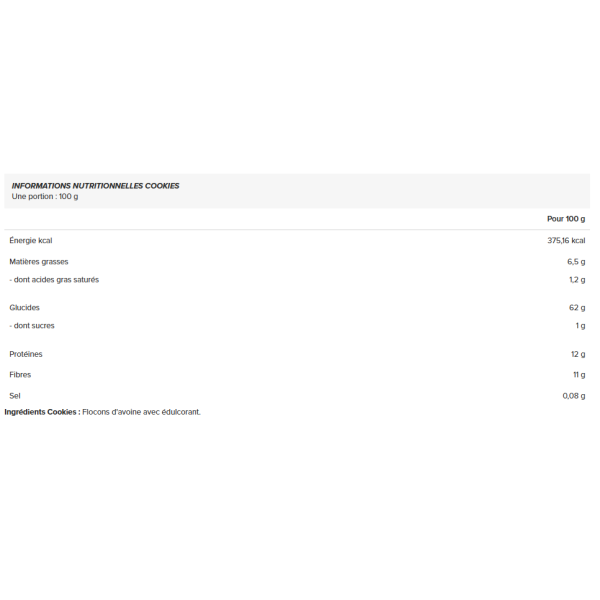 Ingrédients Cookies : Flocons d'avoine avec édulcorant.